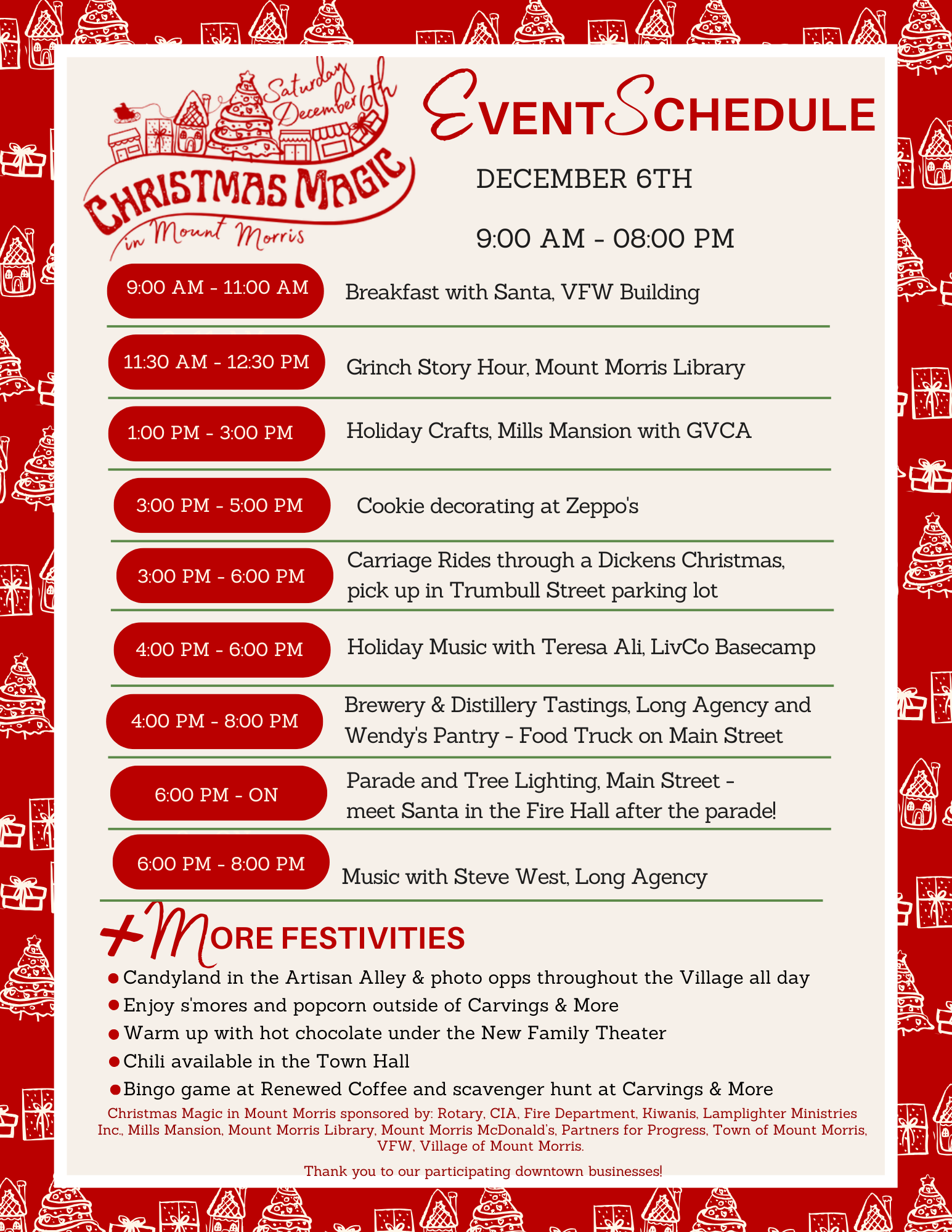 Mark your calendar for Christmas Magic in Mount Morris on Saturday, December 6th! Join us for a full day of holiday events, including carriage rides, holiday crafts, a Grinch story hour, a parade, tree lighting, and visits from Santa, of course! The fun begins at 9am with Breakfast with Santa and free events are open to the public all day. Visit the Christmas Magic in Mount Morris Facebook page for more information!